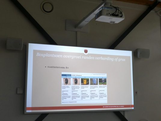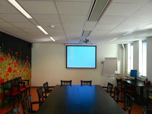 Natuurlijk zal een display niet altijd volstaan. Zeker als de zaal wat groter is, wordt de informatie voor de deelnemers achter in de zaal vaak lastiger leesbaar. Een (laser) beamer met projectiescherm is dan vaak de betere oplossing.